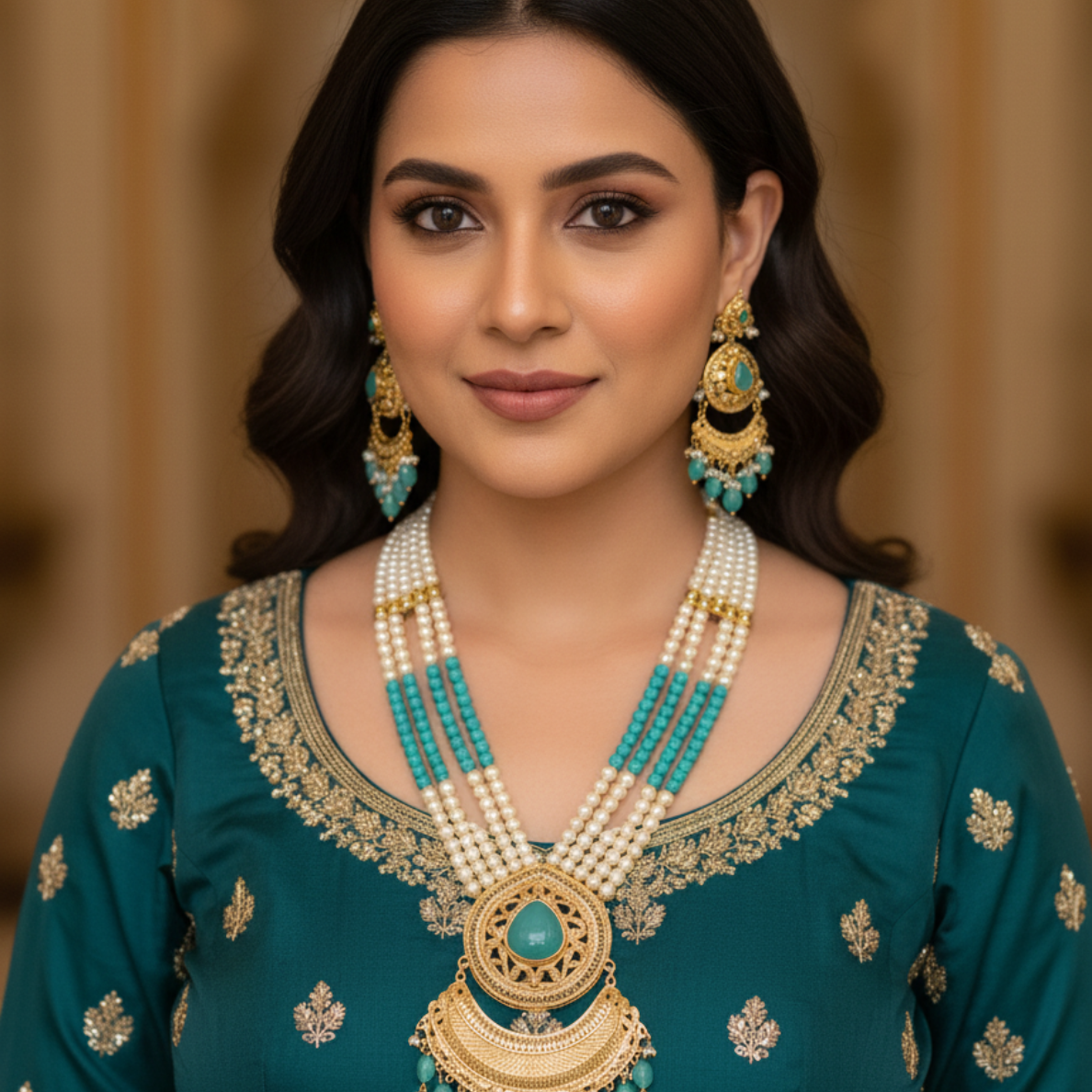 Design: The necklace features a stunning multi-layered design with a central pendant, complemented by a matching pair of earrings. Ideal for weddings, festivals, and grand occasions.